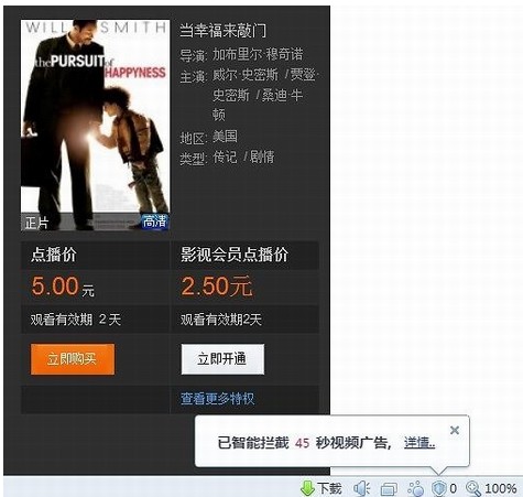 安裝完畢后,打開(kāi)2345智能瀏覽器,其智能攔截的功能便自動(dòng)開(kāi)啟。此時(shí),點(diǎn)擊某視頻網(wǎng)站并打開(kāi)影片《當(dāng)幸福來(lái)敲門(mén)》,瀏覽器右下角立刻彈出“已智能攔截45秒視頻廣告”的氣泡。不知不覺(jué)中,2345智能瀏覽器已為用戶省去了大量時(shí)間,以后每位電影達(dá)人都可以輕松看電影,再不受視頻廣告的騷擾了!