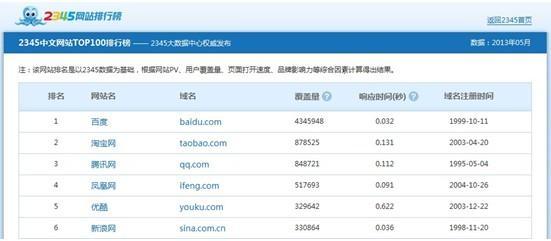 此次,2345試水網(wǎng)站排行榜領(lǐng)域,期望能滿足用戶對于互聯(lián)網(wǎng)動態(tài)的更多需求。在排行榜中,每位用戶均可查看到網(wǎng)站排名、域名、覆蓋量、響應(yīng)時間及域名注冊時間。如點擊網(wǎng)站名或域名都可直接進(jìn)入相應(yīng)網(wǎng)站,這樣可方便網(wǎng)友即時瀏覽和使用喜愛的網(wǎng)站。在TOP100榜單中,隨處可見一些大型的門戶網(wǎng)站和垂直類網(wǎng)站。百度、淘寶和騰訊位列TOP3,而鳳凰網(wǎng)、優(yōu)酷、新浪、搜狐、新浪微博則緊隨其后。人人、天涯、開心、豆瓣等社交網(wǎng)站和熱門社區(qū)也聚集了大量人氣,均取得了不錯的排名。不過,互聯(lián)網(wǎng)的動向總是瞬息萬變,各網(wǎng)站的排名也并非一塵不變,2345將實時更新網(wǎng)站排行榜,將最新最全的排行榜呈現(xiàn)在各位用戶的面前。